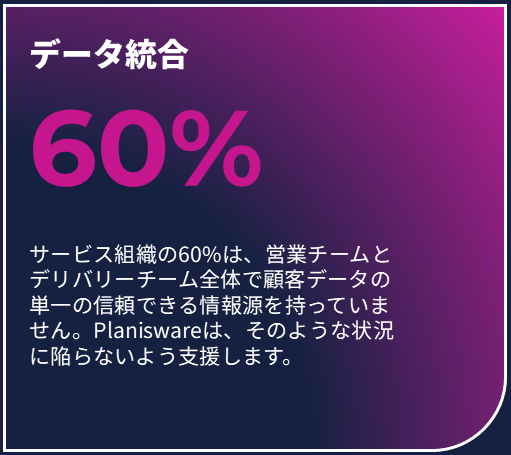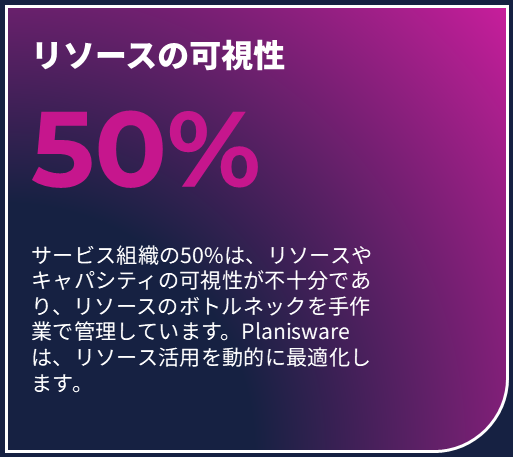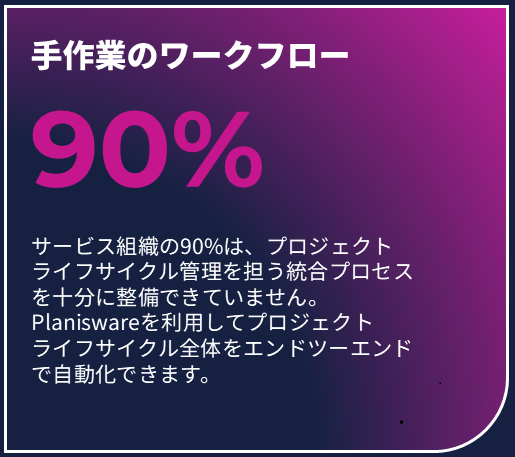 プロフェッショナルサービスの課題に対応するスケーラブルなソリューション PlaniswareのPSAソリューションが価値を提供するユーザー層 COO&サービス部門の担当役員デリバリーの拡張性、リソース活用、可視性、プロジェクト収益性を改善します。 CFO&財務部門の担当役員正確性と効率性に優れた予測・請求・財務ガバナンスを実現し、予算承認プロセスの管理やコンプライアンス対応を含め、確実な財務統制を支援します。 プロフェッショナルサービス部門責任者&デリバリー責任者プロジェクトの可視化、タスク管理、リソース配分を含む業務フローを最適化します。 CIO/ITディレクターインテグリティ、セキュリティ、技術的実現性、拡張性、クラウド提供、エンタープライズアーキテクチャ(EA)およびインフラとの整合性を確保します。 Planiswareは、機会からデリバリーに至るまで、収益創出サービスを支える世界トップクラスのケイパビリティを提供します。 入札から契約完了までの契約管理を効率化 マイルストーン、財務情報、変更指示をリアルタイムで可視化しながら、顧客およびサプライヤーとの契約を管理。統合されたワークフローと一元化されたドキュメント管理により、エンゲージメント全体のライフサイクルを通じて、コンプライアンス、統制、透明性を確保します。 画像 リソースのボトルネックを予測して解消 スキルベース計画とシナリオ分析、キャパシティインサイトにより、需要の最適化と適切なアサインメントを実現し、人員配置リスクを未然に回避します。 画像 チームおよびタスク横断の工数管理を容易に実現 モバイルおよびデスクトップからの入力、タスク単位での精緻な記録、柔軟に設定可能な承認プロセスにより、工数をリアルタイムで追跡。稼働状況、コンプライアンス、パフォーマンスを明確に可視化します。 画像 CRMデータを連携し、より高度な案件計画を実現 統合されたCRMインサイトと自動予測、見積からプロジェクトへのシームレスな移行により、営業パイプラインを完全に可視化。単一の信頼できる情報基盤(Single source of truth)から、計画の迅速化と手作業の削減を実現します。 画像 信頼性と透明性の高い財務予測 プロジェクトのキャッシュフローを迅速にモデリングし、予測をリアルタイムで更新。ポートフォリオ全体の財務トレンドを把握し、開始から完了まで、正確でデータに基づく意思決定を支援します。 画像 画像 画像 画像 画像 画像 導入成功事例をぜひご覧ください Article 導入事例 : ABB社が課題管理を中心に据えたオペレーショナル・エクセレンスを実現 続きを読む Article How Yole Optimized Their Human-Centric Planning with Planisware Orchestra 続きを読む Article 導入事例 : Tractebel社 1,700人のプロジェクトマネージャーが「One Tractebelカルチャー」を築くためにPlaniswareを活用 続きを読む サービスデリバリーをよりスマートに。ここから始めましょう Explore よりスマートで効率的なサービスデリバリーをPlaniswareで実現するための方法に関するリソースはこちら リソースを探す Engage Planisware がサービスチームの成長と効率化を実現する方法を紹介するブローシャーはこちら ブローシャーをダウンロードする Experience よりスマートなプロジェクト実行をPlaniswareで実現するデモをご体験ください デモを申し込む
